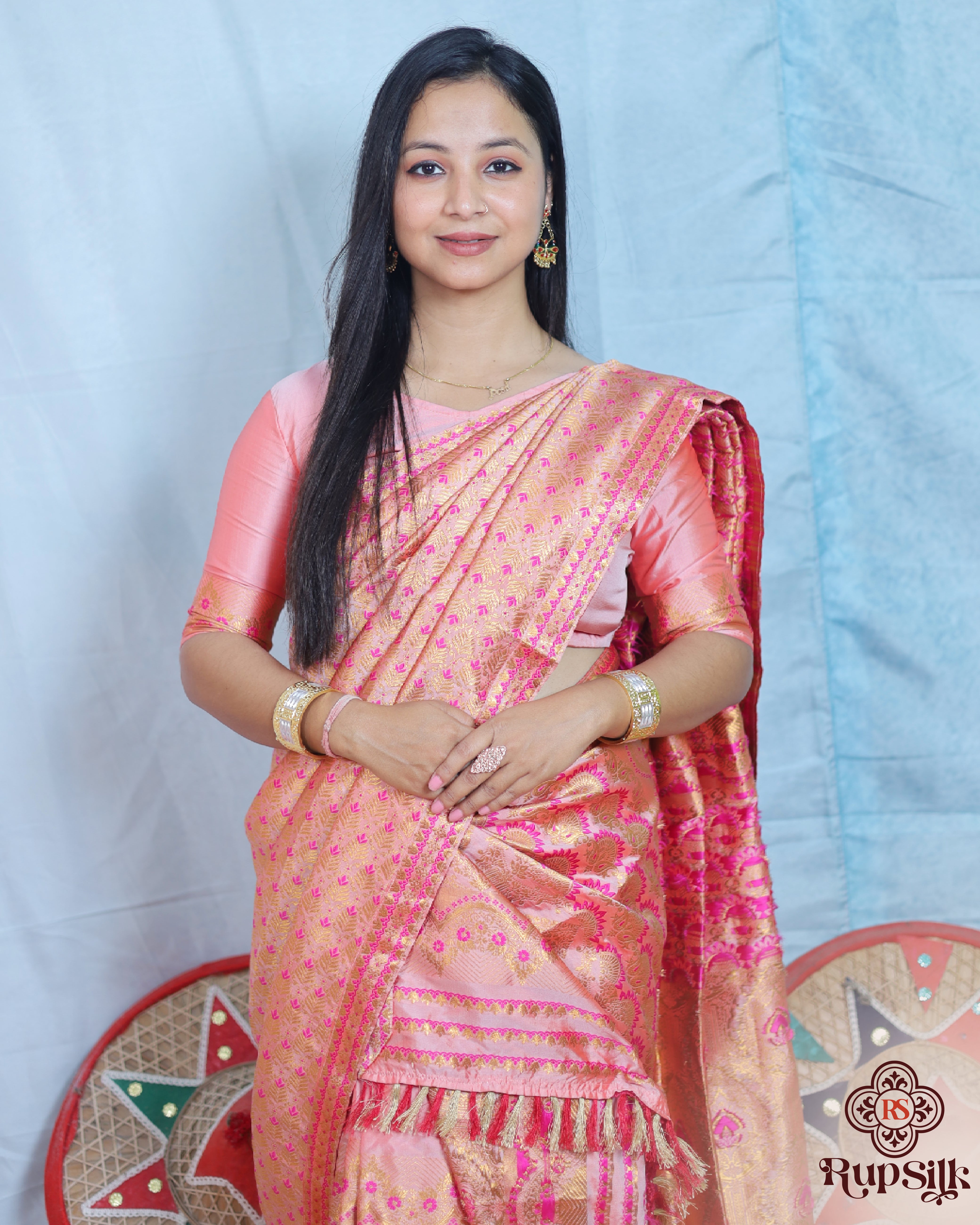 Radiate elegance with this beautiful Semi Paat Silk saree in a charming peach pink shade, adorned with intricate woven motifs and a richly designed pallu. The warm tone combined with fine craftsmanship creates a graceful and festive look, perfect for celebrations and special occasions.