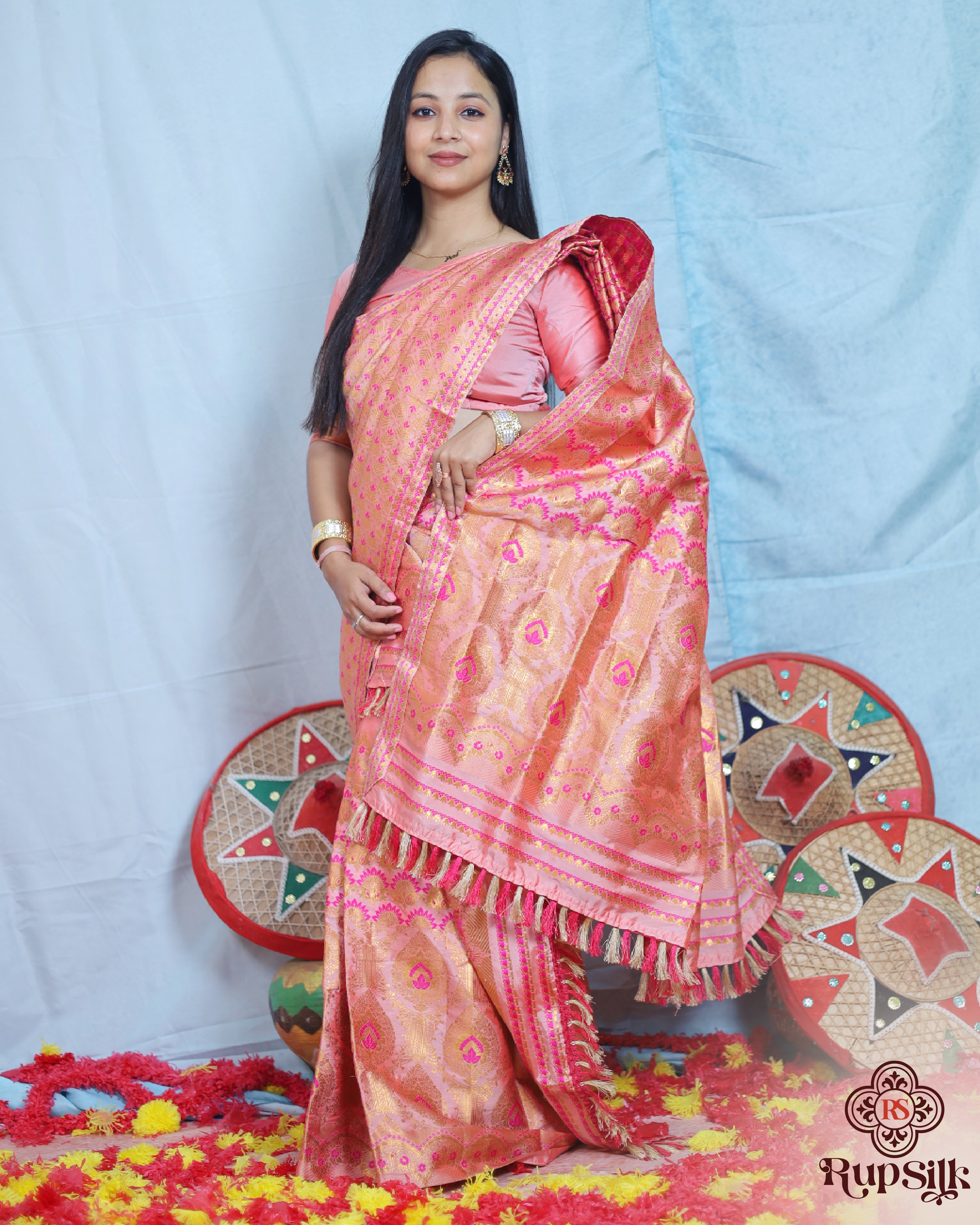 Crafted from premium Semi Paat Silk, this saree offers a smooth, soft texture with a lightweight and comfortable drape. The detailed pallu, enhanced with delicate tassels, adds a touch of sophistication and modern elegance to this traditional piece.