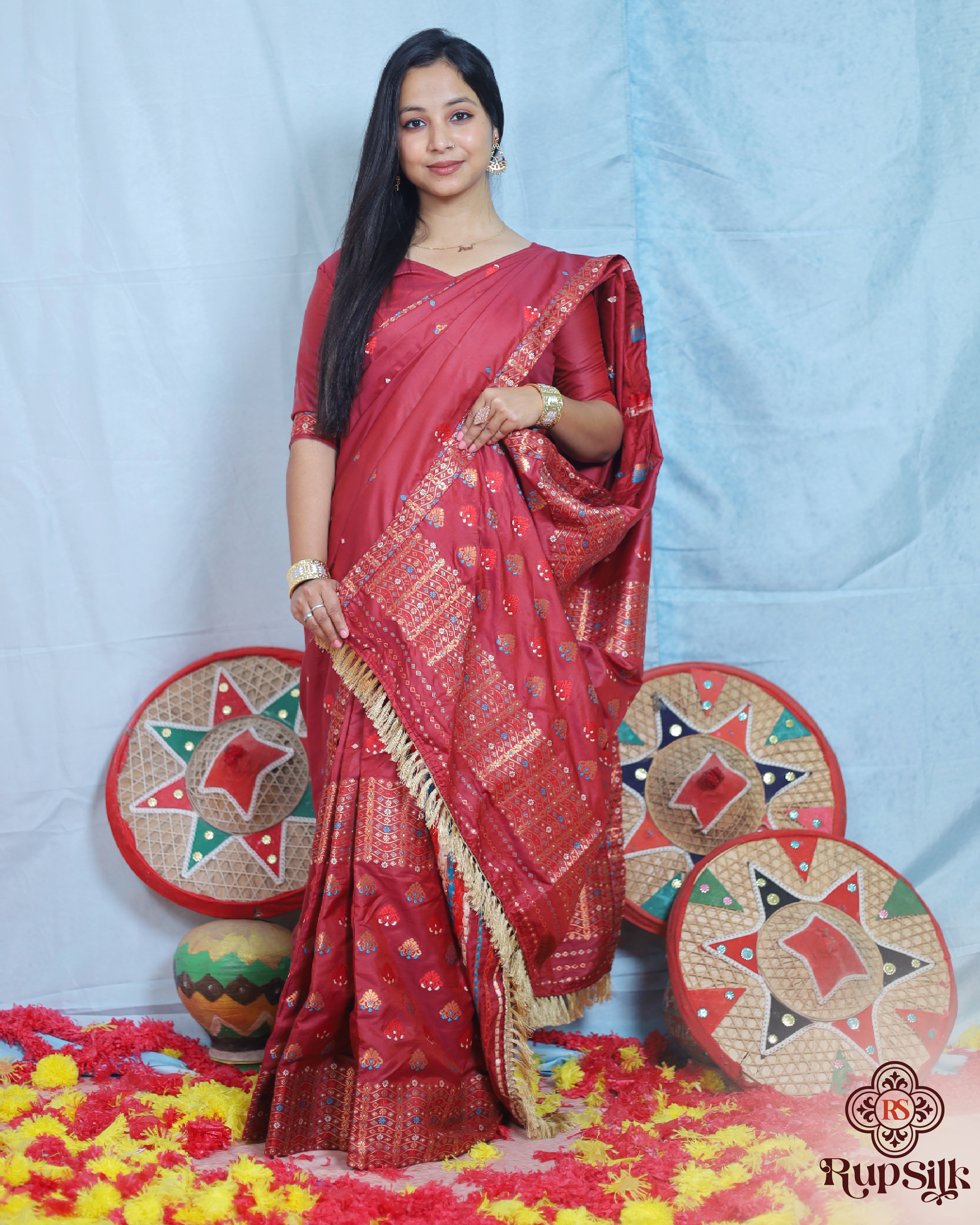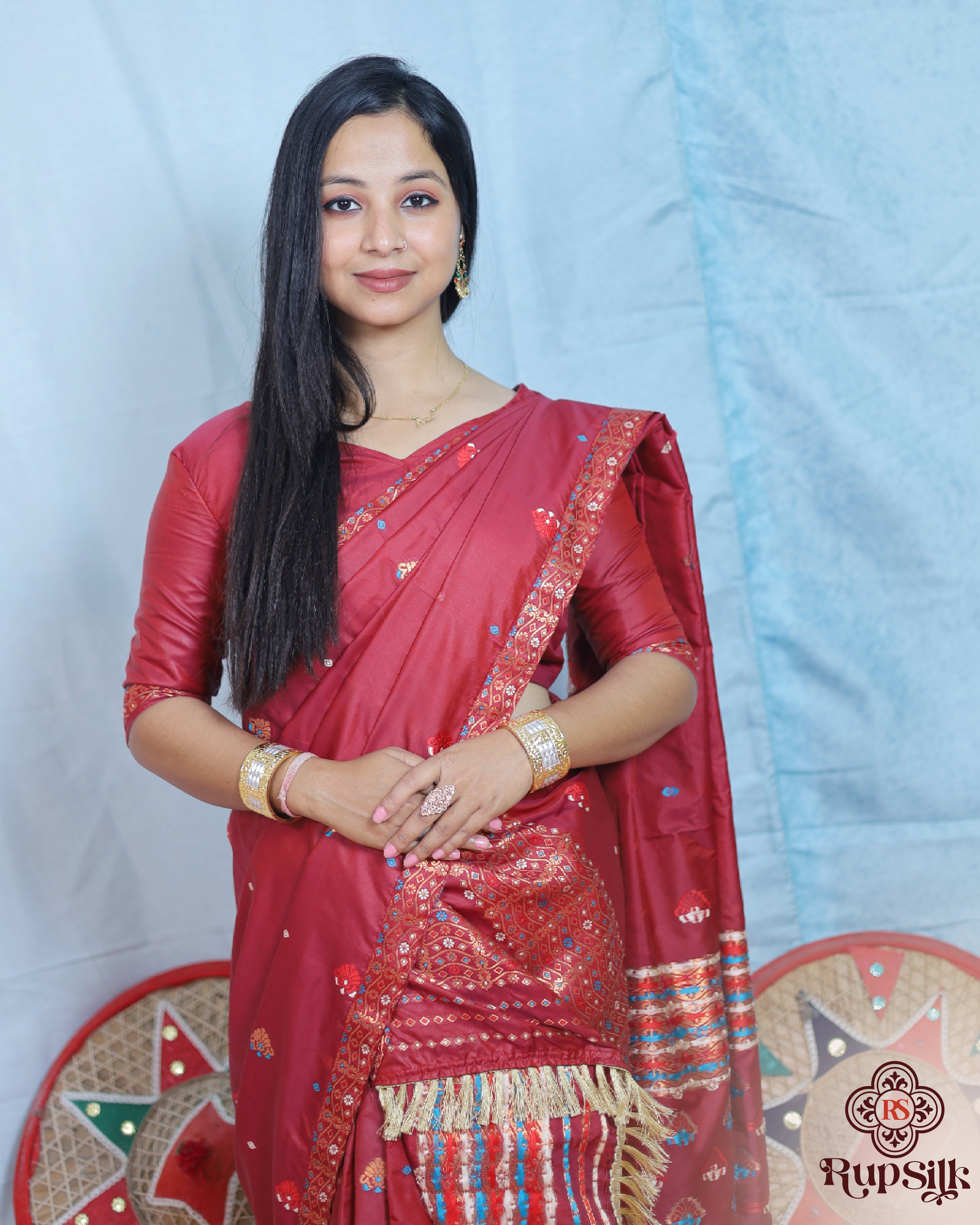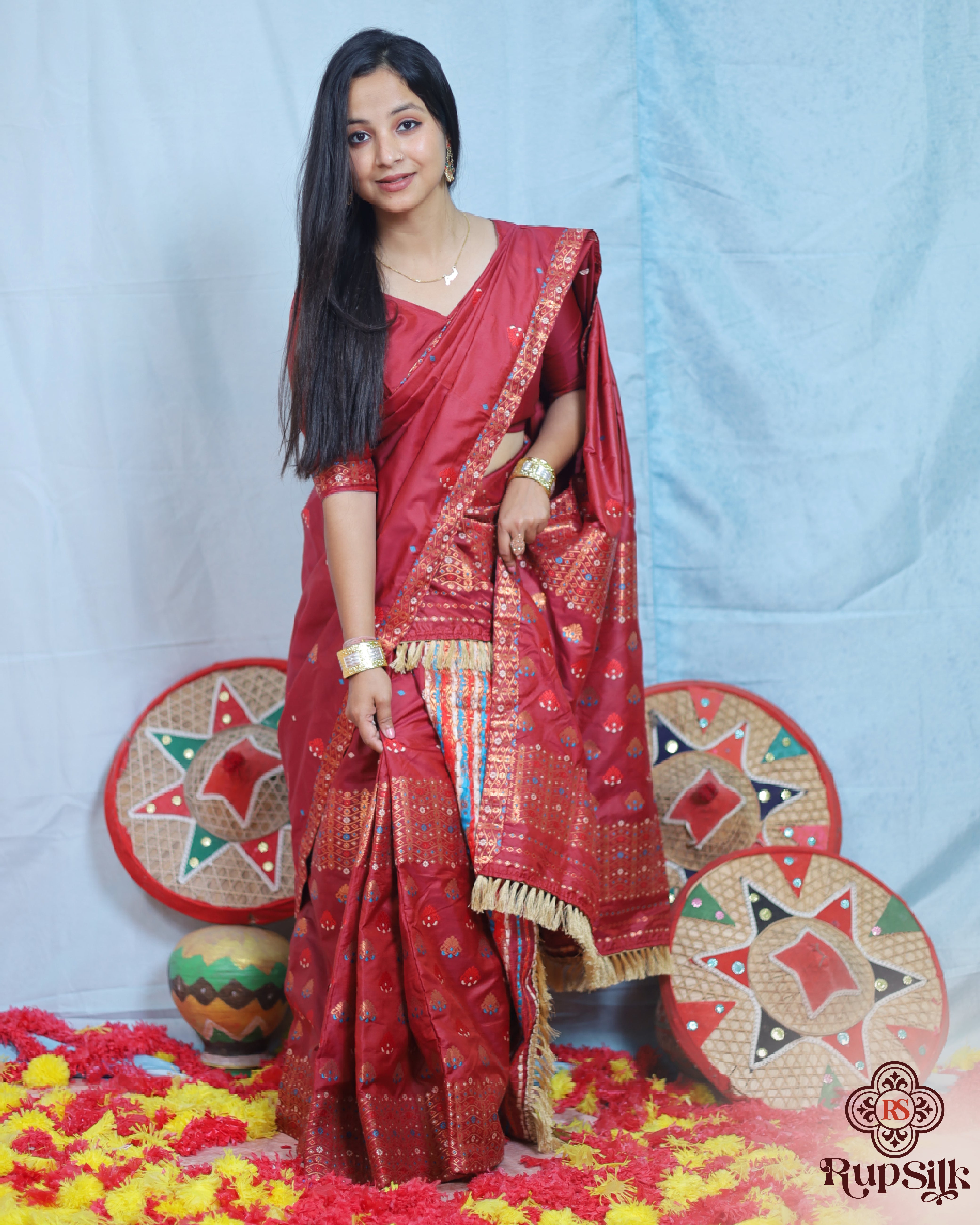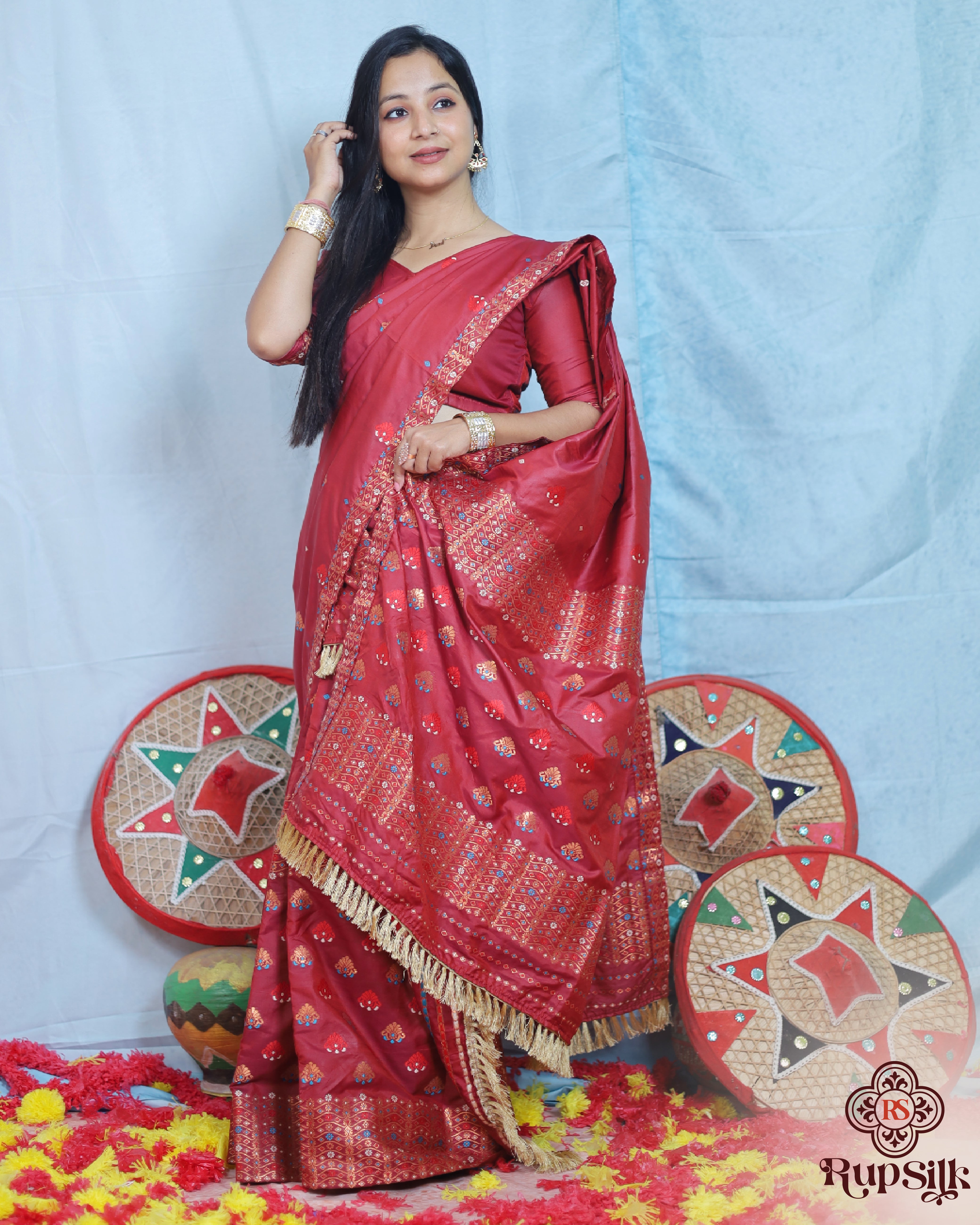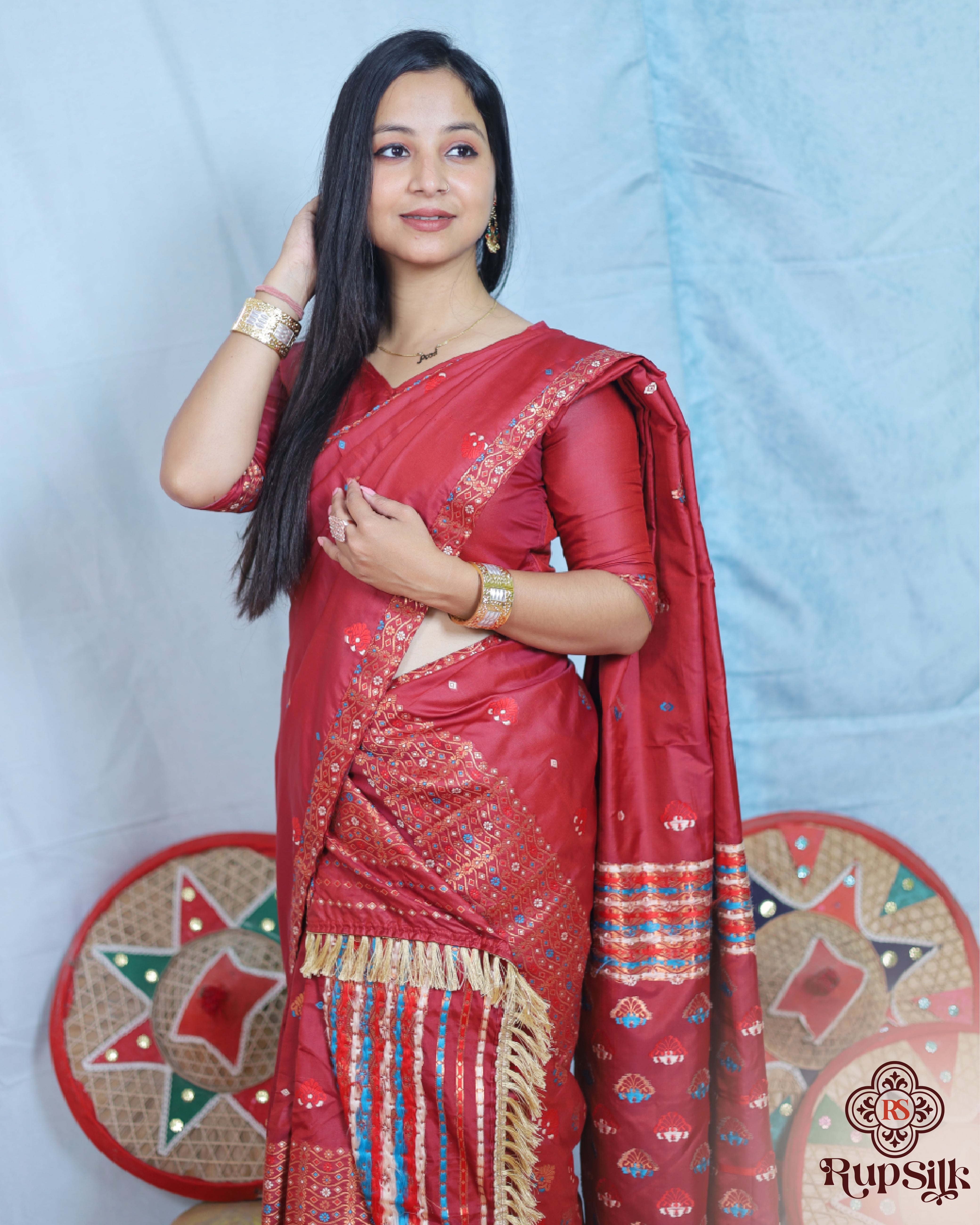 Elevate your festive wardrobe with this exquisite Semi Paat silk saree in a rich regal red hue. Beautifully adorned with intricate woven motifs and enhanced by a striking multicolor border with elegant tassel detailing, this saree reflects timeless tradition with a vibrant contemporary touch.