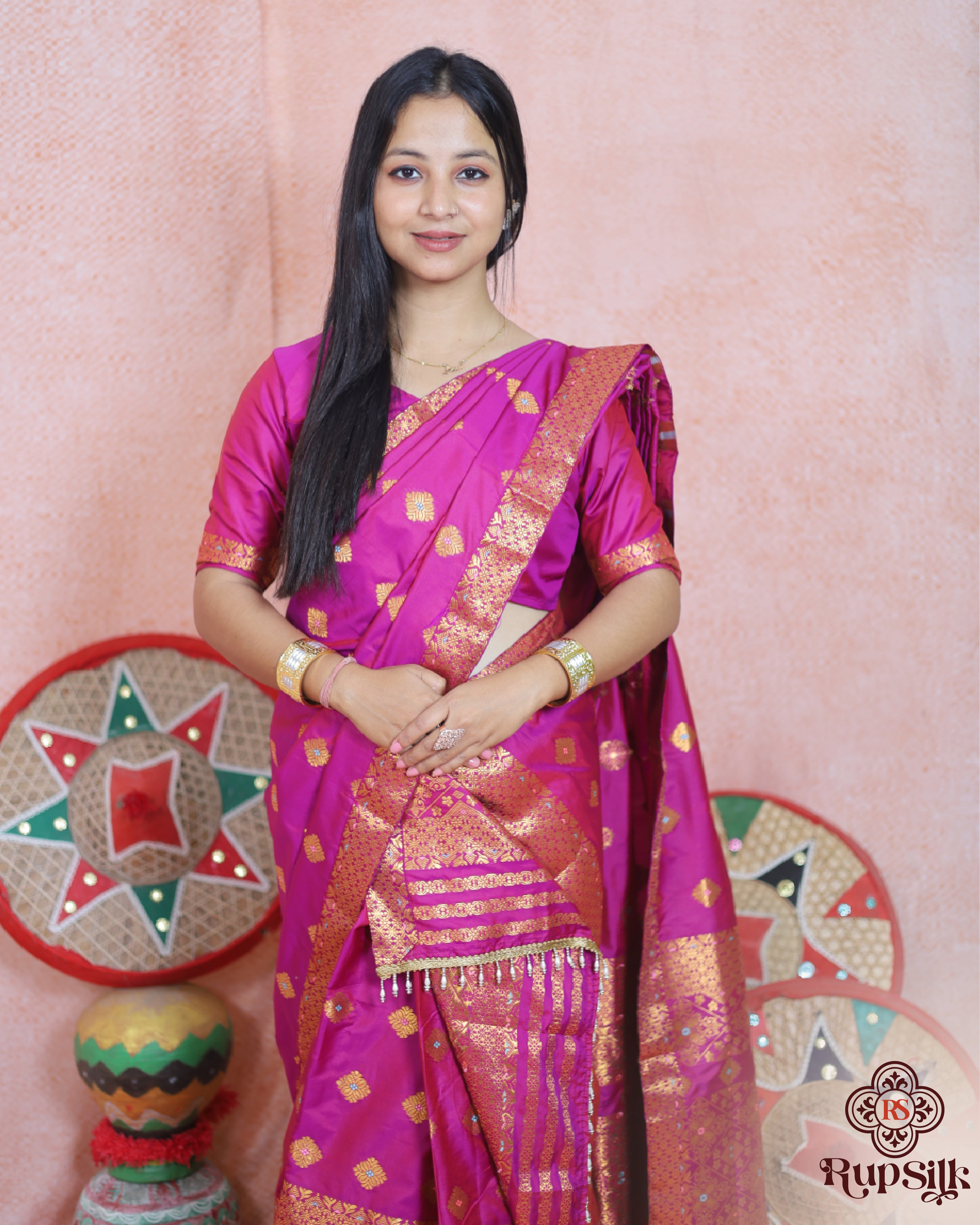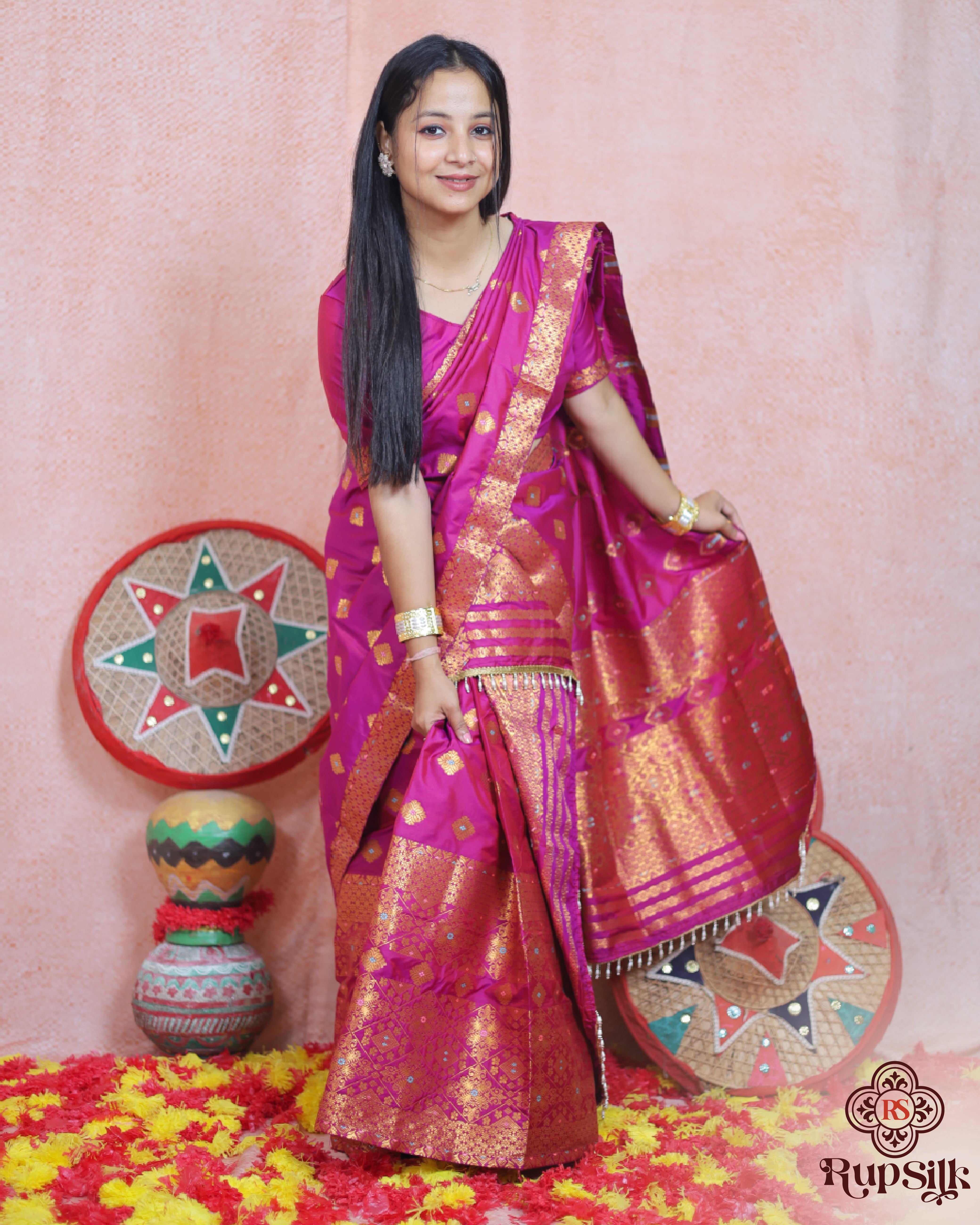 The smooth texture and natural sheen of Semi Paat silk create a graceful and structured drape, enhancing your silhouette with elegance. The elaborate pallu, ornate woven patterns, and fine tassel detailing add depth and grandeur, making it a perfect choice for weddings, festive gatherings, and cultural celebrations.