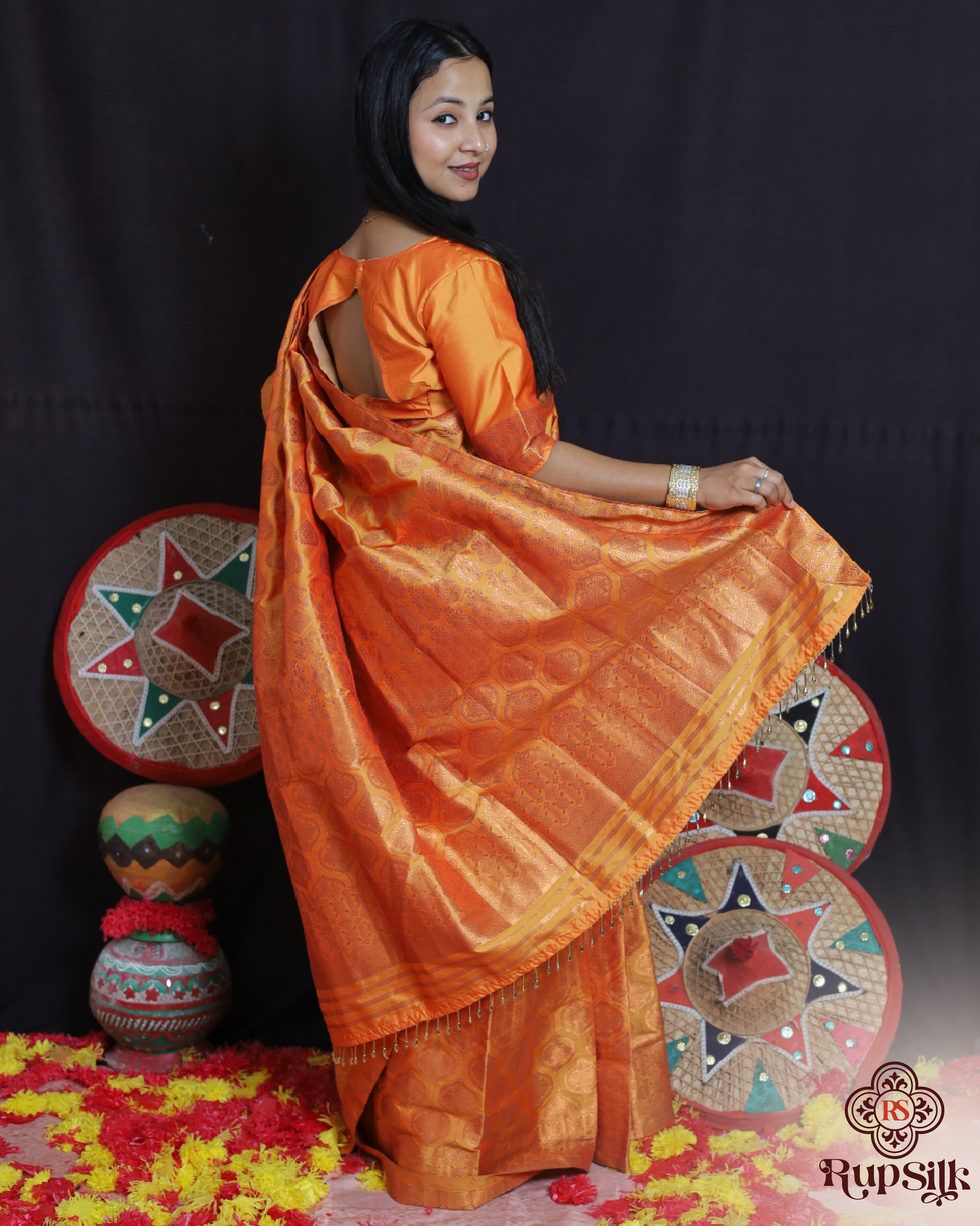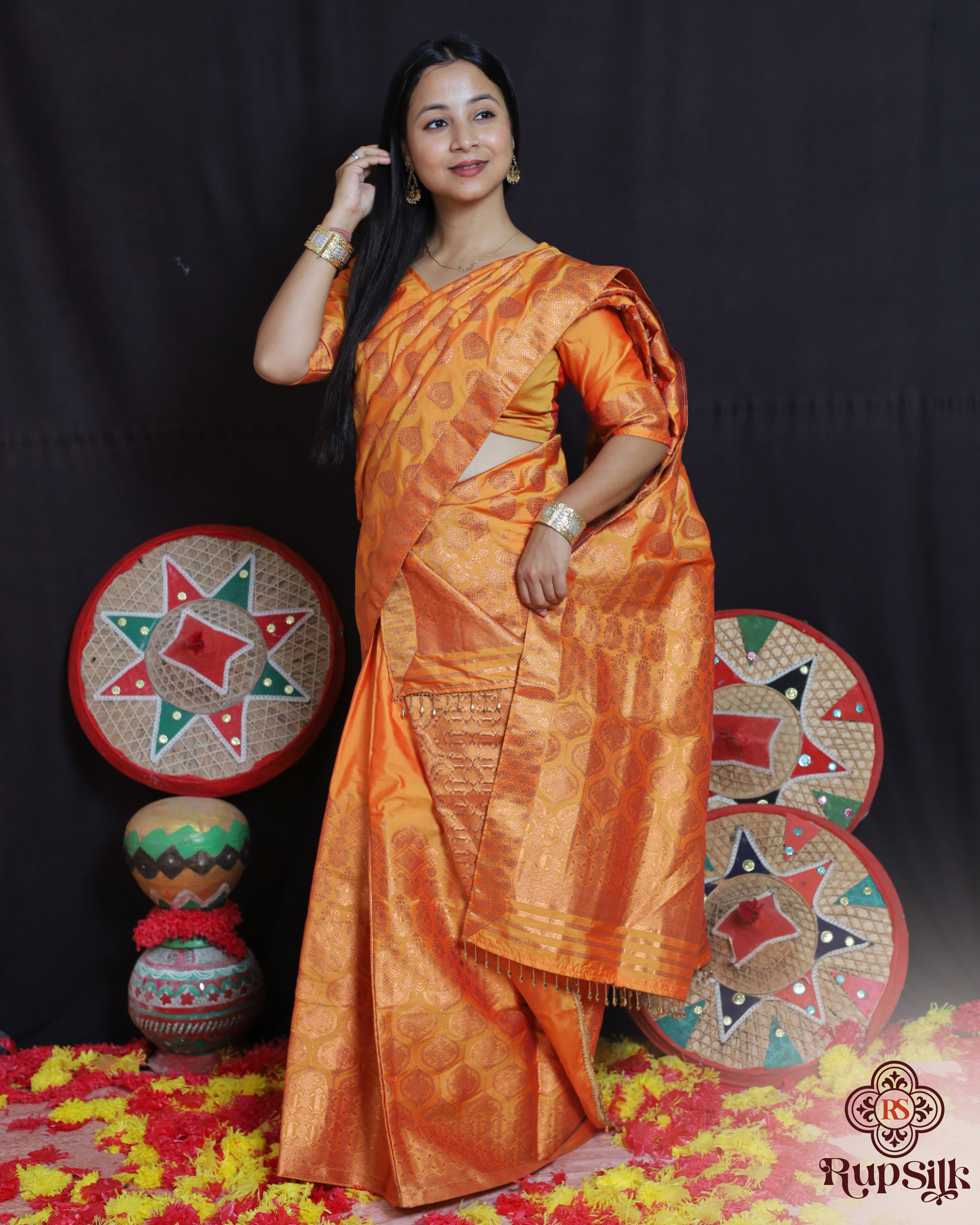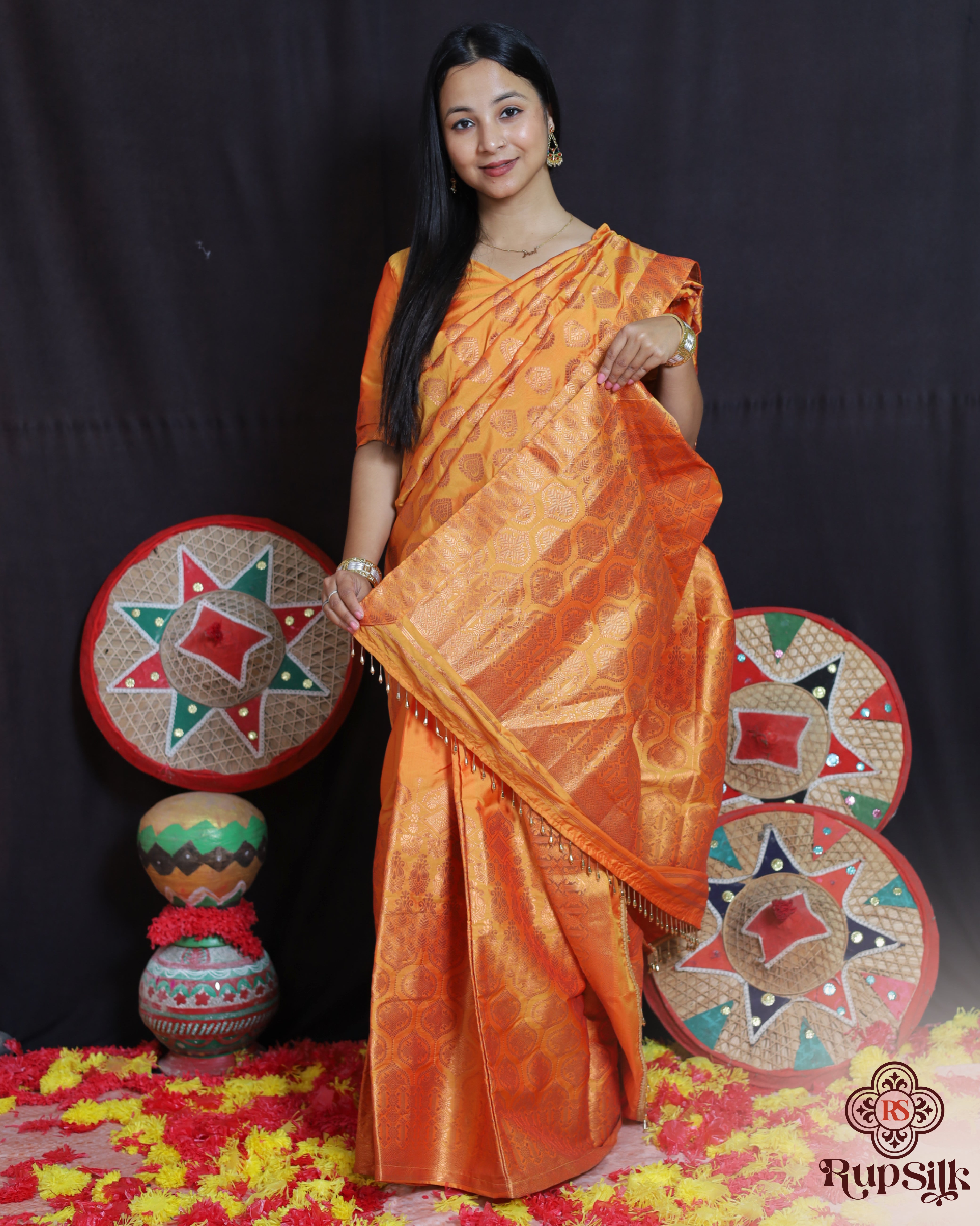 Make a bold and graceful statement with this stunning Semi Paat silk saree in a vibrant royal orange hue. Adorned with intricate woven motifs across the body and complemented by a richly detailed traditional border and pallu, this saree beautifully reflects timeless craftsmanship and cultural elegance.